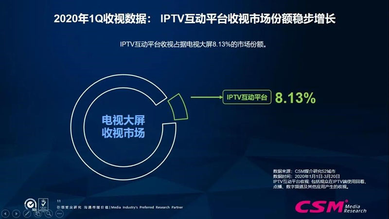 近日,CSM事业发展部总监Andrew Cheng分享了2020年第一季度(数据周期为2020年1月1日至3月20日)IPTV互动平台的最新收视表现。数据显示,全国52个中心城市IPTV互动平台市场份额同比增幅8%,达到8.13%,呈现稳步增长态势。同时52个城市IPTV互动平台到达率超过30.7%,在西北地区达到48.2%,近五成西北地区观众曾使用过IPTV互动平台相关服务。从人均收视时长(观众)来看,52个城市IPTV互动平台观众人均使用时长达到145分钟,较2019年同期增长14分钟,用户忠实度显著。此外,相较于地面频道,IPTV互动平台的观众构成更为年轻,广告竞争力更具优势。
