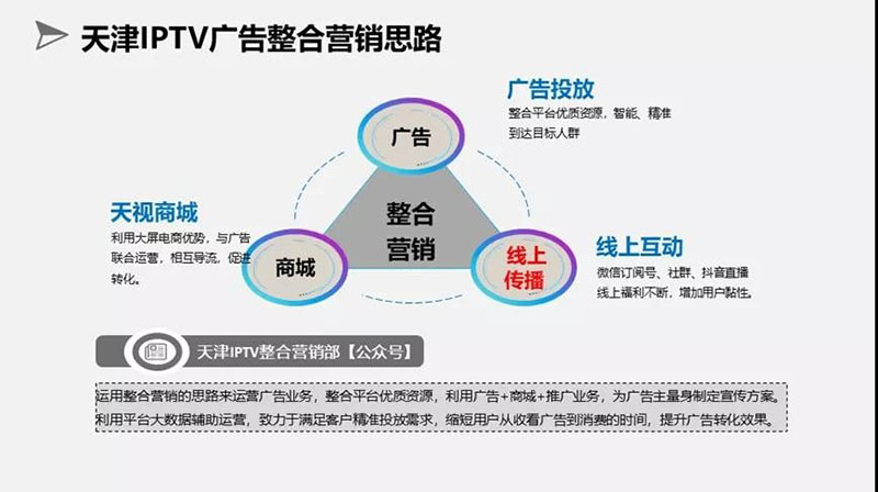 关于天津IPTV的广告整合营销策略,南敬伟表示,IPTV平台从来不缺少流量,缺乏的是流量转化变现的方法。对此,天津IPTV主要从广告与电视电商两个角度出发探索,即运用整合营销的思路来运营广告业务,整合平台优质资源,利用广告+商城+推广业务,为广告主量身制定宣传方案。同时利用平台大数据辅助运营,致力于满足客户精准投放需求,提升广告转化效果。此次疫情期间,天津IPTV整合开机广告、直播换台广告等平台资源,播出天津滨海农商银行公益广告为企业复工助力,取得良好反响。